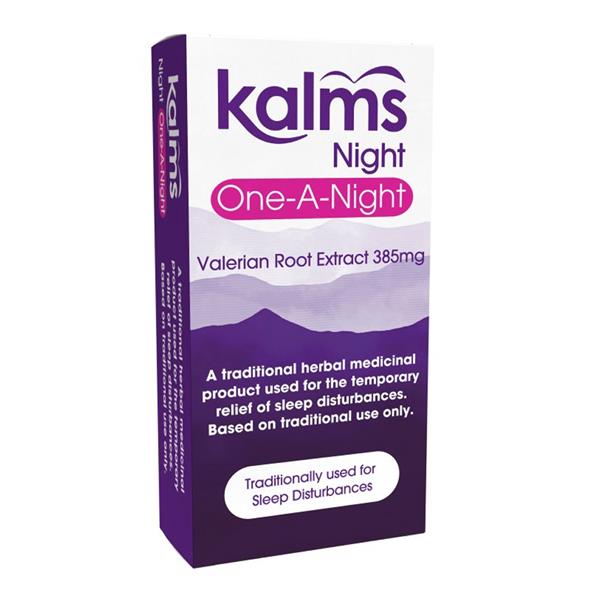 Kalms Night One-A-Night contains valerian, traditionally used for its sedative action to relieve sleeplessness without causing drowsiness the next day.